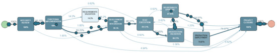 The application of CaProM (see Figure 2B) allowed to discover the process model from the dataset derived from project planning (Section 4.1). The flow was generated using Apromore, a cloud-based process mining tool that employs an advanced discovery algorithm based on Split Miner [25]. The analysis identified the activities and their interactions, which are represented in Figure 6.