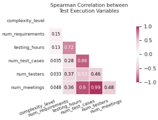 According to the correlation heat map presented in Figure 8, which uses Spearman’s correlation due to the nonlinearity present in some data relationships, it is observed that not all variables in Table 3 exhibit significant correlations, although some demonstrate direct causal relationships. For instance, between num_requirements and num_test_cases, a moderate correlation of 0.28 is observed, despite there being a direct causal relationship between them. Similarly, variables such as testing_hours and num_testers show a positive correlation of 0.53, supporting their causal relationship. However, in the case of complexity_level, a causal influence is identified on the number of requirements, but the correlation is low (0.15), illustrating that a low correlation does not imply the absence of causality.