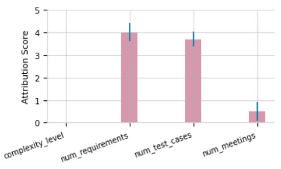 The score attribution graph Figure 10 show how variables num_requirements (37) and num_test_cases (132) had a causal impact on the observed anomaly in num_meetings (29.52), exceeding the deviation thresholds. The direct impact of perturbations in these key variables showed that num_requirements achieved an attribution score close to 4.5, reflecting its predominant influence. num_test_cases had a score close to 4, also a significant impact albeit somewhat lower. In contrast, complexity_level (2) and num_meetings presented low scores of around 0 and 0.5, respectively, indicating that their influence was marginal and mediated by other variables.