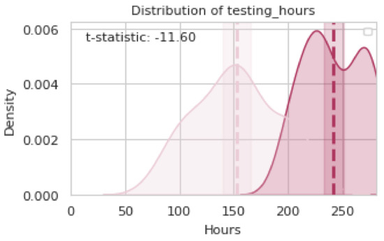 An analysis of distribution changes in a representative subset of the data showed a significant discrepancy in testing_hours between the planned and observed values (see Figure 11). The planned distribution had a mean close to 150 h but the observed distribution (execution) had a central concentration around 250 h. This shift was confirmed with a t-statistic of (−11.60), evidencing a statistically significant difference in the analyzed sample. Further analysis showed that the testing times executed in this subset considerably exceeded the planned estimates, indicating a potential impact on system performance. The technique (Section 4.3.2) quantified this deviation, highlighting the need to identify the underlying causes in the DAG [11].