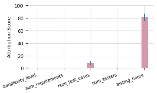 The bar chart reflects the contribution of each variable to the change in the distribution of testing_hours (Figure 12). num_test_cases has an attribution score close to 10, indicating a causal responsibility with respect to the observed change. In contrast, other variables complexity_level, num_requirements, and num_testers present attribution scores near zero, confirming that their effects on the distributional shift were minimal. These results highlight that the most significant change occurred in testing_hours, driven primarily by the causal factors represented in num_test_cases, while the other variables had a marginal influence.