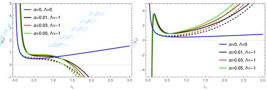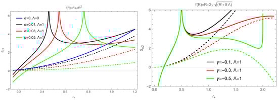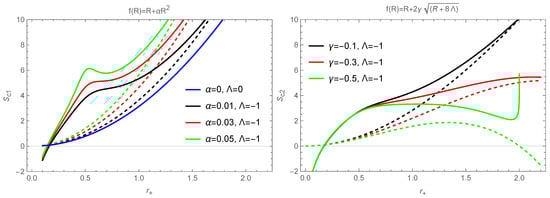 Variation of entropy with the horizon radius for two classes of spherically symmetric BH solutions in the theory. The dashed line represents the Bekenstein–Hawking entropy, and the solid line represents the corrected entropy. In the upper pictures, ; in the lower pictures, . For both models, we set . The blue curve in the left panel represents the result for the RN BH in GR.