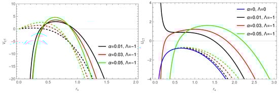 where is the mass of BH, q is the charge, and . This solution corresponds to a constant Ricci scalar: . For (de Sitter–Reissner–Nordstrm spacetime), to ensure that the theoretical model (9) satisfies the stability and the ghost-free constraints, the range of is limited to ; for (anti-de Sitter–Reissner–Nordstrm spacetime), we have [39].