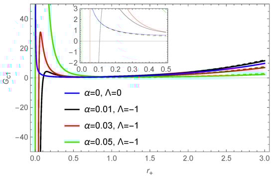 Based on the above equation, we plot the variation of the Gibbs free energy of the BH’s horizon radius in Figure 4. Positive Gibbs free energy indicates that non-spontaneous reactions are occurring inside the BH. This means that the system requires more energy to reach an equilibrium position [110]. In Figure 4, it can be observed that the uncorrected Gibbs free energy is always positive, while the corrected Gibbs free energy can be negative for the small BH.