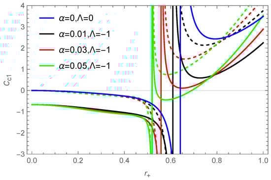 The variation of the specific heat of the BH’s solution (10) in the theory with the horizon radius . The dashed line represents the specific heat without the correction term, and the solid line represents the corrected specific heat. The parameter is taken as . The blue curve represents the result for the RN BH in GR.