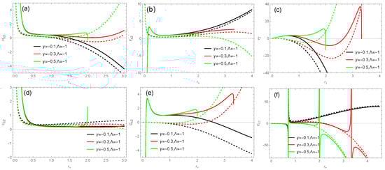 The thermodynamic quantities of the BH’s solution (26) in the theory as a function of the horizon radius : (a) enthalpy; (b) Helmholtz free energy; (c) volume; (d) internal energy; (e) Gibbs free energy; (f) specific heat. The dashed lines represent the thermodynamic quantities without the correction term, while the solid lines represent the corrected thermodynamic quantities. The parameter value is taken as .