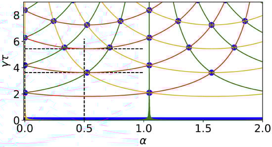 For , the eigenvalues of G are real, and the absolute value is less than or equal to one. is discontinuous at special points when the eigenvalue becomes degenerate. For a finite magnetic flux, the eigenvalues except one () become complex and appear as conjugated complex pairs. There are special points for finite where for certain values of , the eigenvalues of G are degenerate and one (see Figure A2). Therefore, no special points appear at and for all except in the Zeno regime for . In Figure 7b, with a finite magnetic flux is shown. For , no transitions from 3 to 1 and back are present (except in the Zeno limit), while for , the transitions are clearly present due to finite resolution. Following ref. [36], we define: