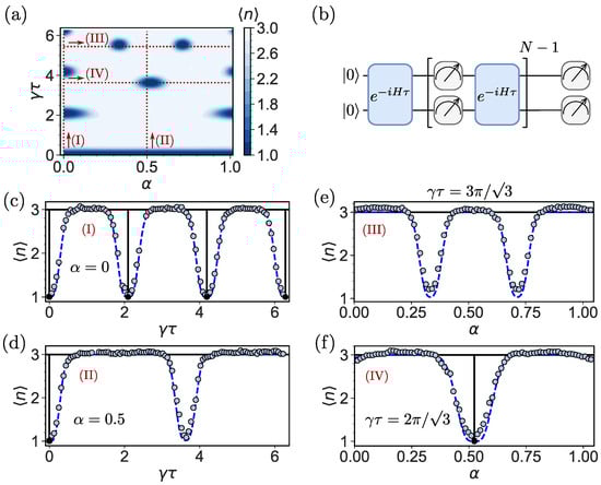 (a) Classical simulation of the mean return time for for the tracking protocol as a function of and . For , three phase factors match (dark blue), and for , all phase factors are different (white). Paths through the parameter space labeled (I), (II), (III) and (IV) are indicated with red dashed lines and correspond to (c–f), respectively. Compared to the phase factor matching diagram in Figure 2, the dark blue areas are broadened due to finite N. (b) Quantum circuit for two qubits representing the three localized states for the tracking protocol with the initial state , where the unitary and the measurements are applied alternately. (c–f) Mean return time recorded on IBM Sherbrooke (light blue circles), obtained with the asymptotic theory for (black solid line) and simulated for (blue dashed line): (c) [path (I)] versus for . is quantized (), and its value, for almost any choice of , differs by unity from the on-site measurement protocol, the case presented in Figure 3c when . (d) [path (II)] For finite magnetic flux , the transitions to are absent except in the Zeno limit at for . This is different for . The result for shows a transition to approximately at . (e) [path (III)] Mean return time for . For , develops additional transitions that are absent for (f) [path (IV)] Mean return time for as a function of . We see a clear broadening effect of the resonance, while in (d,e), broadened resonances show up, which are not present in the asymptotic theory.