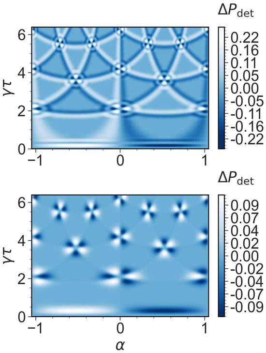 and therefore, the control parameters are and . In Figure 5c,d, we plot the detection probability for the on-site and tracking protocols, respectively, and find a striking difference. For comparison, the corresponding simulation is shown in Figure A3 in Appendix D.