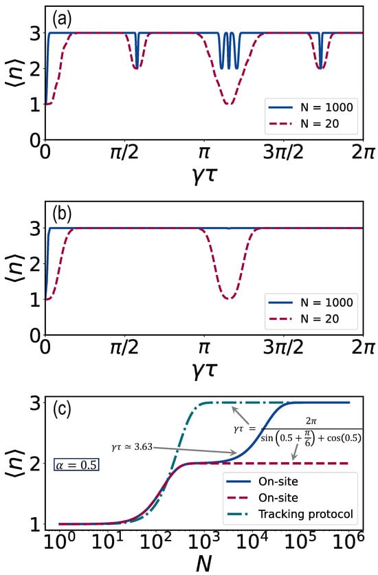 The parameter regime is indicated by a dashed vertical line in Figure A1a at . The line crosses five phase lines where two phase factors merge. Three of them are very close. For very large N in the on-site protocol, five transitions from to are seen.