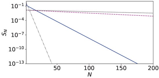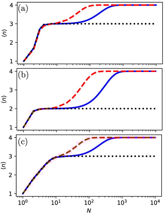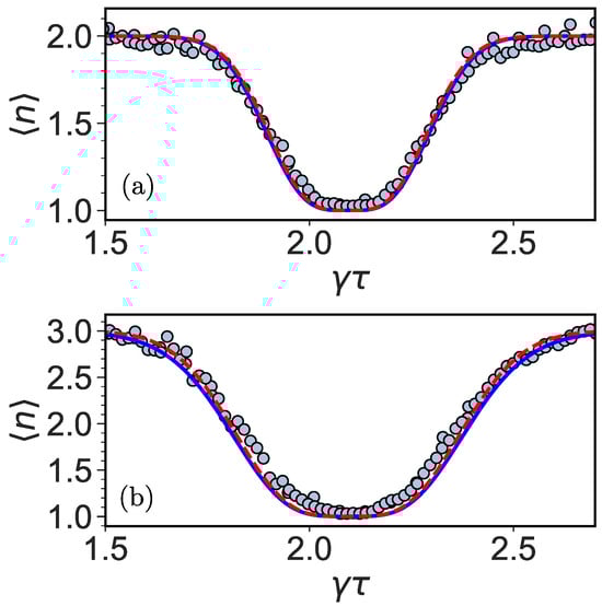 Let us first discuss the results of the asymptotic theory using Equation (7). In Figure 3c–f, we consider versus the dimensionless sampling time , as well as the magnetic flux (black solid line). For almost any , on average, we return after two measurements, i.e., . This holds when the magnetic flux is turned off (). In contrast, when , we have very special choices of , , which is related to the fact that the magnetic flux removes the degeneracy by breaking the time-reversal symmetry and the rotational invariance. In addition, one observes typical sudden plunges in . These are found for special values of and . As mentioned in the introduction, these transitions, e.g., dips in when plotted versus or are related to a discontinuous change in the topology of the underlying generating function [7,8,15].