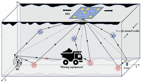 In this paper, we consider a rectangular coal mine tunnel and establish a coal mine channel model based on a 3D multiple input–multiple output (MIMO) GBSM under the 3GPP standard framework []. A three-dimensional description of an IRS-assisted coal mine wireless communication system is illustrated in Figure 1, which consists of a base station (BS) equipped with K antennas, an IRS with N low-cost passive reflecting elements, a single-antenna User and one single-antenna ME. In Figure 1, the gray lines represent the direct links between antenna pairs, and the red blank and blue solid circles represent the collections of multipath components generated by the reflection and refraction of the signal due to the roughness of the tunnel walls and scatters in the space. In this system model, the IRS is installed on the tops of tunnels and can be flexibly deployed along the horizontal axis, which forms a plane together with the BS, User and ME. We established a three-dimensional Cartesian coordinate system with the BS as the origin, denoting the coordinates of the BS, IRS, ME and User as , , and , respectively. We assume that = = = 0. Moreover, the direct link between the BS and the User is blocked by the mining equipment, which also interferes with the reflection link.