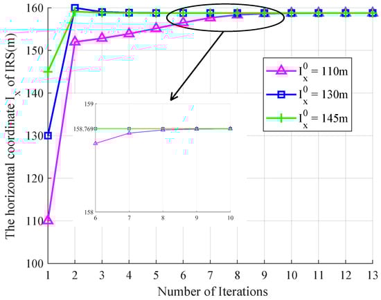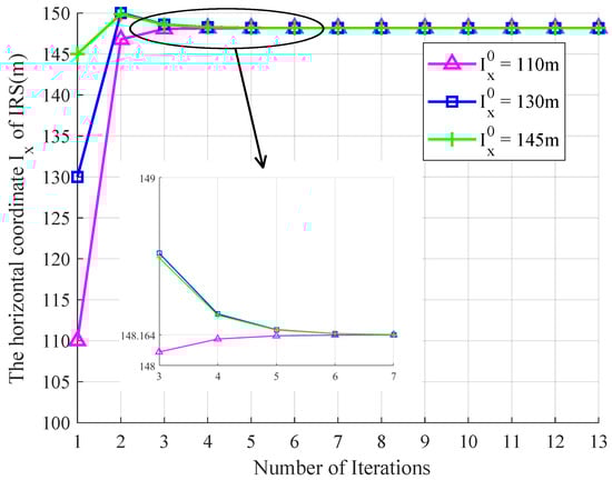 We first simulated the effects of different initial horizontal deployment positions on the convergence to the optimal horizontal deployment position using the horizontal coordinate optimization algorithm proposed in Section 3.1 with the total transmit power dBm and the roughness as shown in Figure 3. The three initial horizontal coordinate were set to be 110 m, 130 m, and 145 m, respectively. From Figure 3, it can be seen that when the number of iterations was increased to about 7, these three curves all convergd to the same optimal horizontal coordinate m, which indicates that the optimized horizontal coordinate obtained by the proposed optimization algorithm is independent of the initial deployment positions of the IRS.