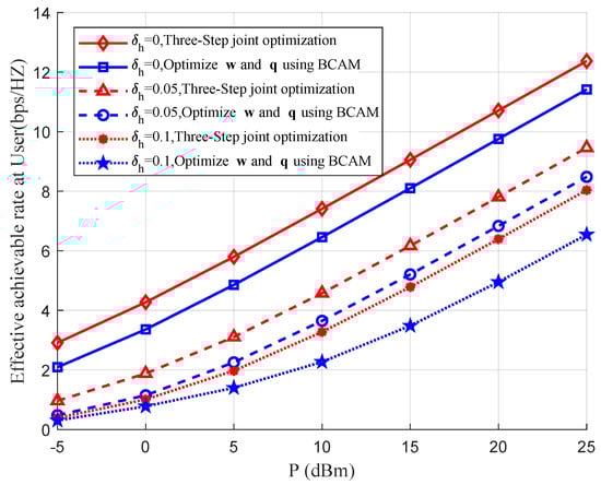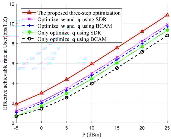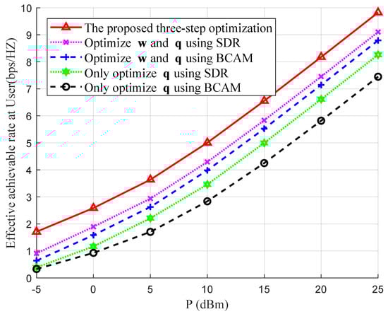 Next, we compared the effective achievable rates at the user using different rate optimization schemes, including the proposed three-step joint rate optimization algorithm, the SDR algorithm in [] and the BCAM algorithm in [] under the coal mine channel model, as shown in Figure 4. It can be observed that the effective achievable rates obtained by the proposed three-step joint rate optimization scheme are the highest. Compared to the SDR algorithm and the BCAM algorithm, which optimized and alternately, the effective achievable rates could be improved by approximately and when varying the total transmit power P from dBm to 25 dBm, respectively. In addition, and improvements were obtained in comparison with these two algorithms which only optimized without beamforming at BS. The simulation results verify the necessities of optimizing the deployment position of the IRS in coal mines and the effectiveness of the proposed three-step joint rate optimization scheme.