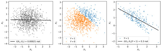Left: Two random, normally distributed variables and with zero mean, unit variance, and . There is no mutual information between them. In the example of movie stars, and might be analogous to attractiveness and talent. Center: we can define a third random variable as a threshold function: , analogous to the “selection” criteria that define who will be a movie star as a function of whether they reach some minimal threshold of attractiveness and/or talent. Right: If we then compute the mutual information between and conditional on , we see a spurious correlation, suggesting that and are anticorrelated, when they are actually independent. This is Berkson’s paradox.