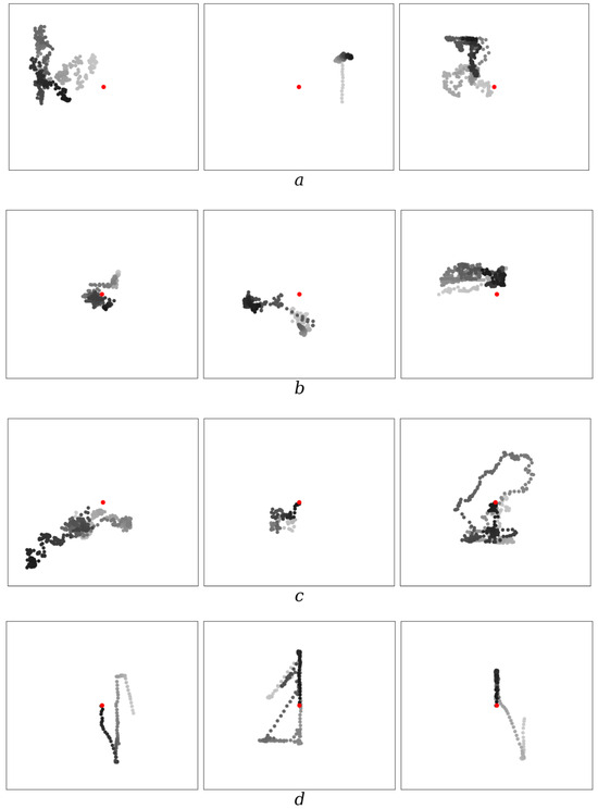 Figure 1. Examples of trajectories of the agent (predator) relative to the prey for different epochs of evolution: (a) 100 epoch, (b) 200 epoch, (c) 400 epoch, and (d) 800 epoch. The position of the prey, indicated by the red dot, is in the center (the reference frame is placed in it). The positions of the agent are shown by dots of varying degrees of blackness: from gray (corresponding to the beginning of the movement) to black (corresponding to the end of the movement). δ = 0.05 and Ψ =100.