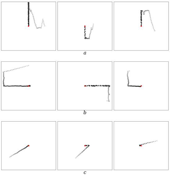 Figure 2. Examples of strategies of an agent (predator) catching prey on a 256 × 256 field. (a) Catching with the agent aligned vertically with the prey; (b) catching with the agent aligned horizontally with the prey; (c) catching prey by the agent along the shortest straight-line trajectory. The position of the prey, indicated by the red dot, is in the center (the reference frame is placed in it). The positions of the agent are shown by dots of varying degrees of blackness: from gray (corresponding to the beginning of the movement) to black (corresponding to the end of the movement). δ = 0.05 and Ψ = 100.