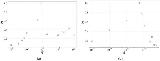 Figure 3. The success rate of prey capture by an agent (K) as a function of genome length, Ψ (a), and relative number of mutations, δ (b). K is taken as the ratio of the total number of captures per 10,000 epochs by an ensemble of 100 agents to the maximum value achieved during modeling. This coefficient gives an average and robust estimate of the success of the evolution of the catching skill of agents. In the calculations, we assumed δ = 0.05 for (a) and Ψ = 100 for (b).