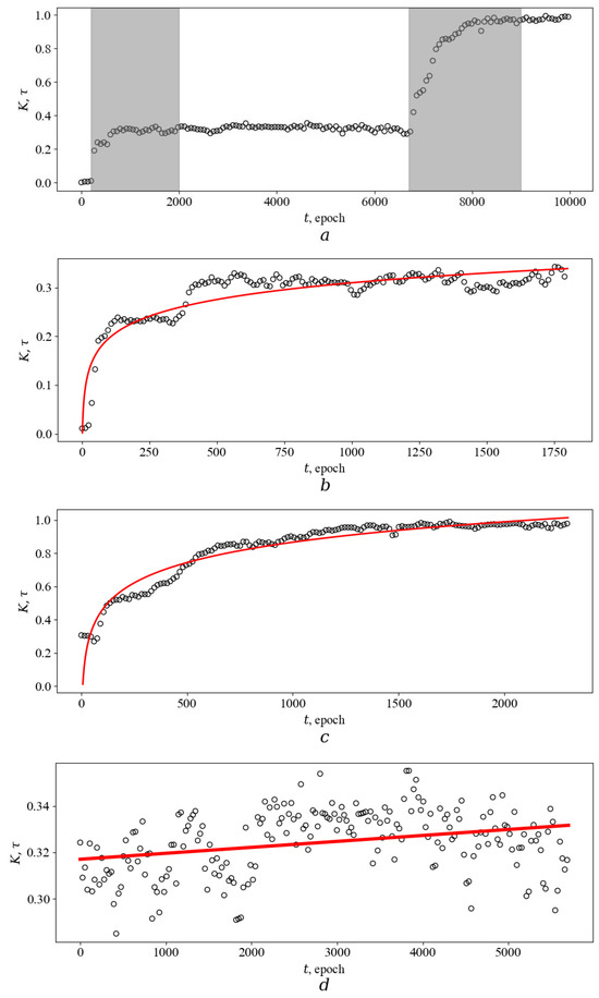 Figure 5. Evolution of an agent with two jump changes. The success rate of prey capture by an agent (K) or development time τ as a function of astronomical time t. K is taken as the ratio of the total number of captures per one epoch by an ensemble of 100 agents to the maximum value achieved during evolution (10,000 epoch). δ = 0.05 and Ψ = 100. (a) Modeling result (two nonlinear parts of the evolution are highlighted in gray. (b) The first nonlinear part of the obtained dependence τ(t) (dots) and its fitting (red line) using the logarithmic function are presented in large detail. The logarithmic fitting is 0.05 × ln(t) − 0.03, coefficient of determination, R2 is 0.80. (c) The second nonlinear part of the obtained dependence τ(t) (dots) and its fitting (red line) using the logarithmic function are presented in large detail. The logarithmic fitting is 0.18 × ln(t) − 0.36, coefficient of determination, R2 is 0.92. (d) The linear part of the obtained dependence τ(t) (dots) and its fitting (red line) using the linear model are presented in large detail. The linear fitting is 2.6 × 10−6 × t + 0.32. The slope, according to the calculation, is reliably not equal to zero: (2.6 ± 0.2) × 10−6.