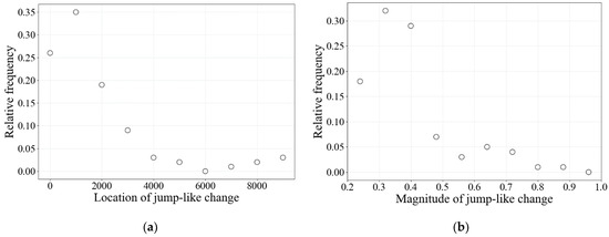 The relative frequency of occurrence of some values of (a) location and (b) jump magnitude at jump-like changes K. δ = 0.05 and Ψ = 100.