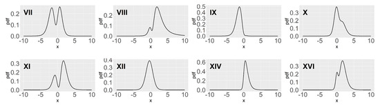 Figure 1 shows the density plots corresponding to eight parameter settings in Table 1, which are enough to represent the plot of GAST density. As shown in Figure 1, there are four cases in which the pdfs are bimodal and the No. XII and XIV GAST distributions are AST and ST distributions, respectively.