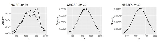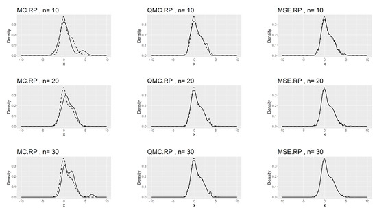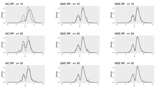 We observe that the MSE-RPs have the same mean as the population expectation, which is described in (9). Compared to MC-RPs and QMC-RPs, the MSE method estimates the moments of the model more accurately. The comparison of the kernel density plots is presented in Figure 8.