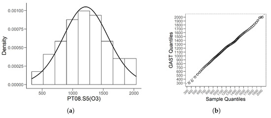 These data are from the website (https://archive.ics.uci.edu/dataset/360/air+quality (accessed on 15 September 2024)), which contains hourly averaged responses from an Air Quality Chemical Multisensor Device in an Italian city. We selected the “PT08.S5()” (denoted as “” in this article) data as the study object. After setting the interception time from September 1 to November 30 in 2004, and removing the missing values, we derive 90 observations. We summarize the parameter estimation results of obtained by the QMC-MLE in Table 10, providing the estimated GAST model as follows