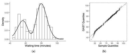 The histogram with the fitted density for Faithful Geyser data is given in Figure 7a. Denoting as the order statistics of this bimodal data, we calculate its quantiles by the traditional estimator: