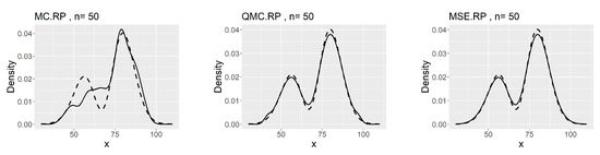 The comparisons of the kernel density estimates based on MC, QMC, and MSE RPs are presented in Figure 6.