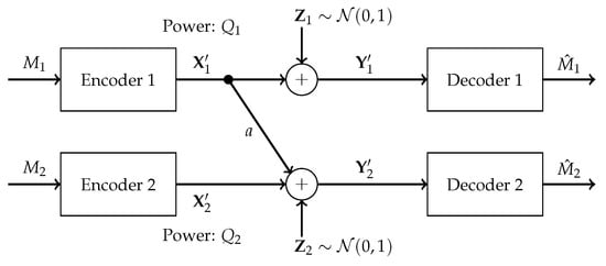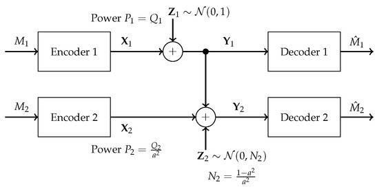 - Sato, H. On degraded Gaussian two-user channels (Corresp.). IEEE Trans. Inf. Theory 1978, 24, 637–640. [Google Scholar] [CrossRef]