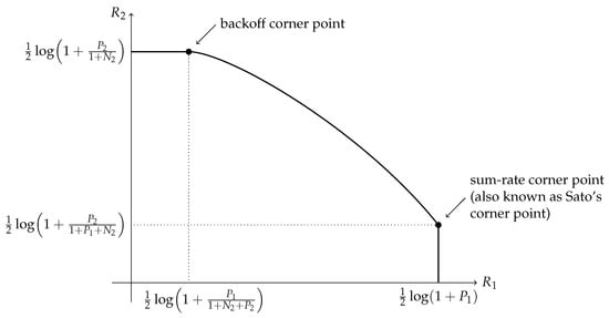 - Phase 3: Interference cancellation at the weaker receiver (the backoff corner point)In this phase, the weaker receiver, , decodes first, subtracts this from the received signal, and finally decodes its own signal . The rate pair achieved in this phase isNote that the rate for message 1 is solely determined by the ability of the weaker decoder to decode it. This encoding strategy is similar to that in a degraded message sets Gaussian broadcast channel where message 1 is meant to be communicated to both receivers.