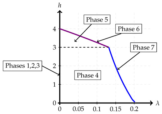 - Path 4: For some set of parameters (for example, ) the optimal path seems to be Phase 1 → Phase 4 → Phase 7 → Phase 6 → Phase 3. The phase transitions occur at (approximately) , , , and , respectively.This path is depicted in Figure 14.