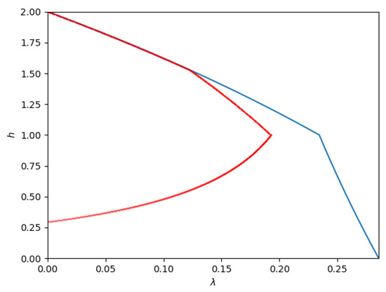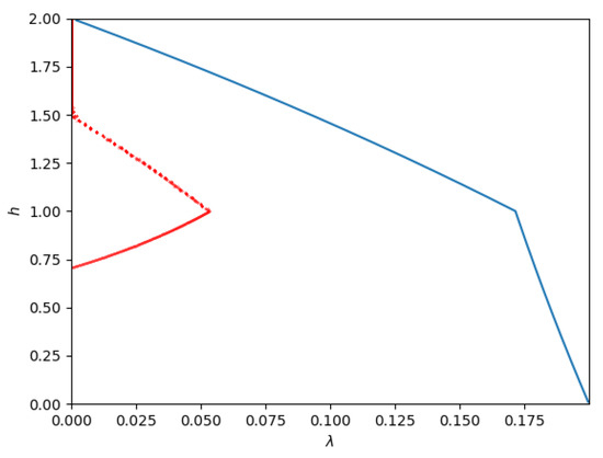 - Path 1: For some set of parameters (for example, ) numerical simulations indicate that the optimal path is Phase 1 → Phase 2 → Phase 3. This is the path of pure superposition evolution, and the locations of the phase transitions occur at and , respectively. This implies that the trajectory in the admissible region is only along the h-axis, i.e., with .