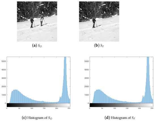 This paper will concentrate on a particular form of forgery called copy–move, where a segment of an image is replicated and pasted within the same image. Figure 2 illustrates an instance of this type of forgery. Figure 2a depicts the original image, whereas Figure 2b presents the altered image. Figure 2c,d display the histograms of Figure 2a,b. The histograms are close to each other so that specific detection method should be designed.
