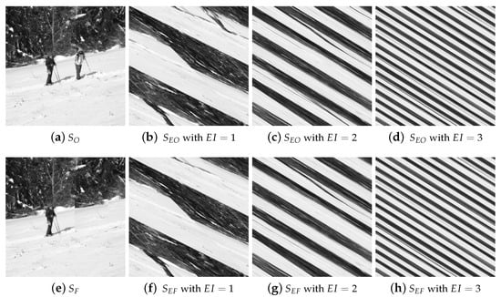 Figure 3 shows the experimental results of Arnold permutation illustration, where . The initial image is displayed in Figure 3a, and its counterfeit image is depicted in Figure 3e. Figure 3b–d display the encrypted image of Figure 3a with , respectively. Figure 3f–h demonstrate the encrypted image of Figure 3e with , respectively. According to Figure 3b–d and Figure 3f–h, we cannot discern the content of the images from their encrypted forms, demonstrating that the Arnold permutation successfully encrypts an image.