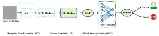 As depicted in Figure 4, the architecture of our developed LEFN encompasses a variety of key components, including but not limited to, the feature extraction (FE) module, global average pooling (GAP), the fully connected layers, and a softmax node. The FE module is constructed using a sequential of CNN layers to extract increasingly hierarchical abstract features to automatically model the target’s statistical distribution, eliminating the need for hand-crafted features. The global average pooling (GAP) is empirically applied to compress the extracted feature maps and it can scale the feature maps to , thus enabling the input image to be of any size. Furthermore, it can encode overarching data and decrease the input dimensions for the subsequent fully connected layer, leading to a notable reduction in network parameters. The ultimate classification is accomplished by the fully connected layer in conjunction with the softmax node. Alongside these fundamental modules, the KV kernel functions as a high-pass filter to differentiate the high-frequency signals that usually differentiate the variations between the encrypted authentic image and the encrypted forged image. Moreover, we also designed a receptive field expansion (RFE) module to enlarge the receptive field for capturing long-range correlations and contextual spatial information, thus hierarchically aggregating the forged information from local to global. After training and learning, without any human interference, our designed LEFN can automatically distinguish whether an encrypted image has been maliciously forged.