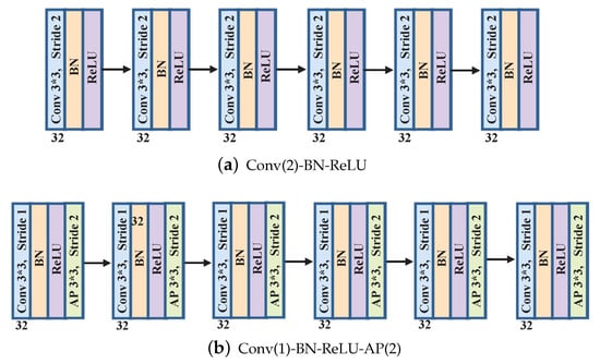 Figure 5 displays two different frameworks of the FE module. To reduce memory consumption, we apply downsampling to compress the size of feature maps, Figure 5a,b display two classic operations for downsampling. In Figure 5a, strided convolution with a stride of 2 is directly utilized for downsampling. Following each convolutional layer, a batch normalization (BN) operation is applied to normalize all components within each feature map to possess zero mean and unit variance, thus preventing gradient back-propagation from becoming stuck in local minima. This procedure enhances the stability and speed of network training. The rectified linear units (ReLUs) function as activation functions to enhance nonlinear representation. We select 3*3 as the kernel size because it is the smallest receptive field to capture local correlations including left/center/right. Number 32 represents the channel number of each layer. Different from Figure 5a, Figure 5b applies the additional pooling layer with stride 2 to achieve downsampling, while the convolution layer is only responsible for feature extraction. Note that the above-mentioned two frameworks have the same amount of parameters.