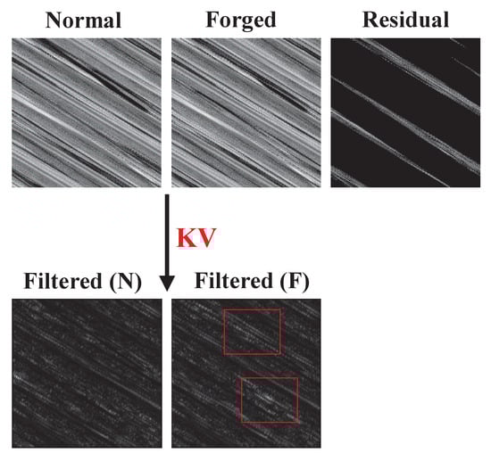To demonstrate the impact of the KV kernel distinctly, we use a set of encrypted normal and forged images as a case paper. We showcase the resultant filtered images alongside the residual image, derived from pixel errors between the encrypted normal and forged images, in Figure 6.