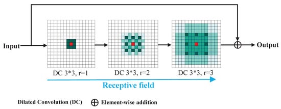As depicted in Figure 7, the expansion of dilated convolution layers leads to a gradual enlargement of the receptive field for capturing surrounding information. Ultimately, the final receptive field is capable of entirely encompassing a square region. Additionally, to safeguard critical data essential for the final classification, we implement a residual connection [] to directly transmit raw input information to the output, utilizing element-wise addition in this process.