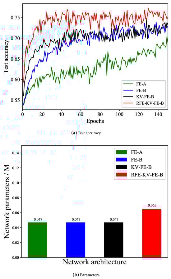 Ablation study on the network design. (a) Test accuracy of different network architectures; (b) parameters of different network architectures.