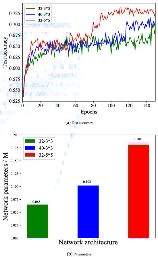 Validation of adding network parameters. (a) Test accuracy of different network architectures; (b) parameters of different network architectures.