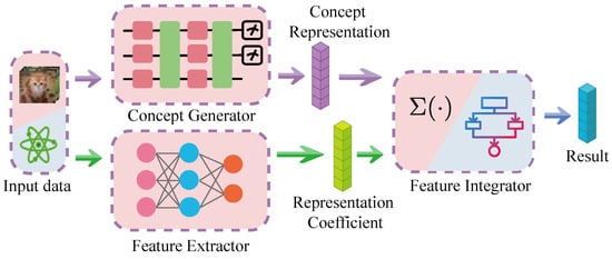 The CD-QNN model is composed of three fundamental components: a concept generator c, a feature extractor θ , and a feature integrator g. The comprehensive architecture is depicted in Figure 2. In this structure, the concept generator compresses the raw data into a sparse conceptual representation, which can be realized through the encoder of a QVAE. This encoder converts raw data into a conceptual representation comprehensible to humans. The feature extractor, typically realized by a DNN, is tasked with extracting pertinent information from the raw data to ensure adequate expressivity. The feature integrator amalgamates various concepts into the final output. To preserve the model’s interpretability, the feature integrator should be as simplistic as possible. This simplicity aids in understanding each concept’s contribution to the final output.