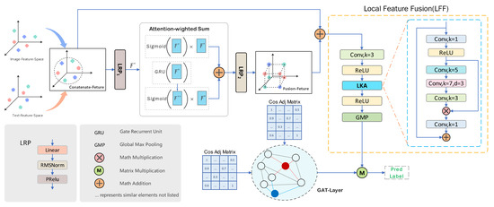 Graph Attention Feature Fusion Module (GAFM) architecture integrates and aligns image and text features through the interaction of Layerwise Propagation Rule (LPR) and Gated Recurrent Unit (GRU), employing Local Linear Fusion (LLF) to mine multiscale information internally. The features are ultimately fed into the GAT to generate predicted pseudo-labels.