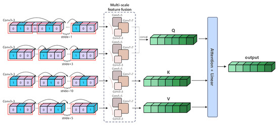 We assign two smaller strides to Q through and , and two larger strides to K and V through and , respectively. This results in the acquisition of a query matrix containing compact information, as well as key and value matrices with significant information. The global dependencies of label information are obtained through the self-attention mechanism. Finally, we use to map the obtained multiscale label fusion features to the required hash code length: