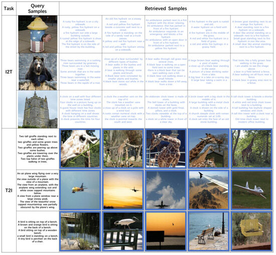 To showcase the effective retrieval capability of our introduced TEGAH approach, we employed the MS-COCO dataset for Hamming ranking, as illustrated in Figure 8. The retrieval instances obtained through our TEGAH approach are all pertinent. This suggests that the TEGAH approach can markedly improve the performance of the text feature extraction network. Moreover, the Multiscale Label Area Hybrid Network can, to some extent, compensate for the scarcity of textual information. Consequently, through the Graph Attention Feature Fusion Module, it is possible to better integrate the semantic information of multilabels, generating more distinctive hash codes. This ability to accurately retrieve relevant results underscores TEGAH’s effectiveness in addressing the challenges of cross-modal hash retrieval, particularly in bridging the semantic gap between different modalities and improving the richness of textual features for more accurate and efficient search outcomes.