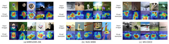 To further validate the capability of the image feature extraction network in capturing global information, Figure 9 presents several examples of feature visualization using our proposed TEGAH method. Across three datasets, we selected 10 images each and visualized their feature maps using the Grad-CAM method, specifically visualizing the outputs before the LayerNorm layer of the last encoder block of the image feature extractor. GradCAM visualizations highlight the regions of the image feature extraction network that may influence the classification decision, which often contain key descriptive elements. For instance, on the MS-COCO and NUS-WIDE datasets, certain images encompass two identical objectives, and the image feature extraction network within the TEGAH method can precisely capture both objectives. This demonstrates TEGAH’s effectiveness not only in feature extraction but also in ensuring that the extracted features are meaningful and relevant to the image content, thereby enhancing the accuracy of subsequent retrieval tasks.