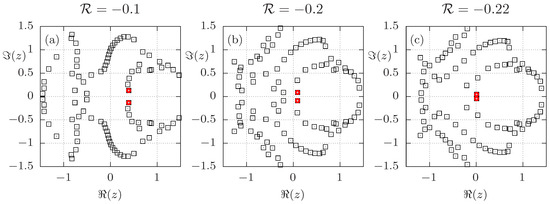 Fisher zeros in the (transformed) complex temperature plane for and (a) , (b) , and (c) . The red circles highlight the Fisher zeros closest to the positive real axis. Note that Mathematica fails to find some zeros close to the real axis, which becomes apparent as some zeros that are visible for and are absent for .