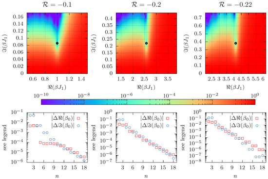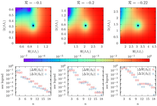 For the cumulant method, when the n-th order cumulants are evaluated at the estimate for goes to zero with increasing n and the approximation of approaches . In principle, one can use any simulation point and obtain estimates for the location of the Fisher zero. However, most precise results are found for . Thus, we can consider and to probe the rate of convergence in n. The bottom panel shows the absolute values and of the differences as a function of n, which appear to decay exponentially. This observation is in line with the fact that the contributions of sub-leading partition function zeros are suppressed with power n, see Equation (10).