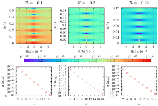 The top row shows for complex h, as obtained from Equation (7) for , calculated by exact enumeration for at . For we used our best estimate, see Section 3.4. The leading Lee–Yang zero is denoted by an open white circle. The bottom row shows the difference in for the approximation given by Equation (13) of order n and the directly obtained value.