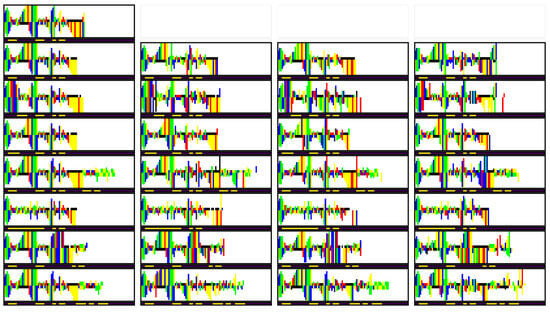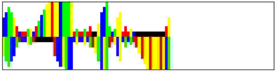 We use the modmiRBase dataset [12], which contains 49602 RNAs from various organisms and is balanced in terms of class. The pre-miRNA sequences in the dataset were sourced from mirbase.org [33] and mirgenedb.org [34]. The non-pre-miRNA sequences were obtained from various datasets, which included existing non-pre-miRNAs with characteristics similar to pre-miRNAs [3,35,36], as well as shuffled or suboptimally folded pre-miRNAs [7]. The RNA sequences are folded using the RNAFold algorithm [37], which predicts the secondary structure by identifying stable configurations where complementary nucleotides bond. Following this, the RNA sequences are encoded as images with dimensions of 100 by 25 pixels [12]. In this encoding, each nucleotide is represented as a colored bar—adenine (A) in blue, cytosine (C) in yellow, guanine (G) in green, and uracil (U) in red. Gaps (represented in black) are added for nucleotides lacking complementary pairs. The length of each bar is inversely related to the bond strength between nucleotides, with strong bonds occurring between base pairs and weaker bonds between other pairs or gaps. Additionally, the length of each bar increases with multiple consecutive weak bonds, while gaps are consistently represented with a length of 2 pixels. This encoding captures the physical structure of the RNA, with the hairpin formations resembling actual hairpins in the images. Additionally, any bulges present in the RNA structure are represented as protruding bars, accurately reflecting the spatial arrangement of the nucleotides. An example of an image encoding can be found in Figure 3.